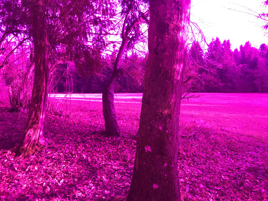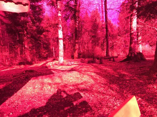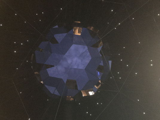 Bild links ist ein riesiges Kaleidoskop mit Blick in den Sternenhimmel von Hamburg. Die Leuchtpunkte haben sich durch das Blitzlicht beim Fotografieren ergeben.
